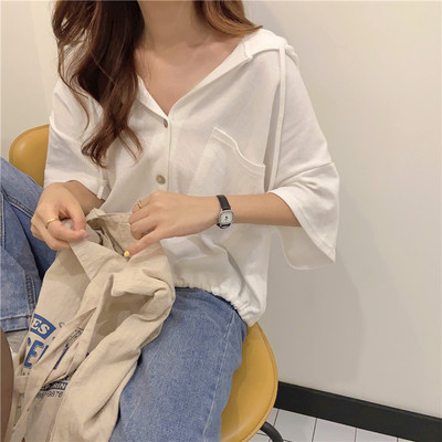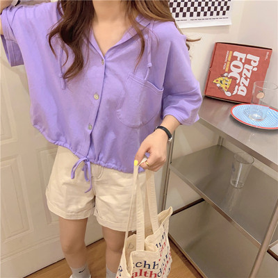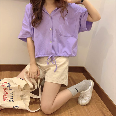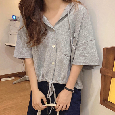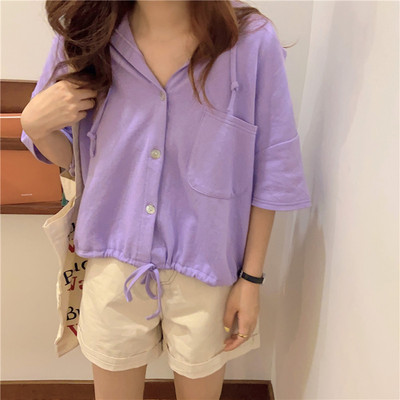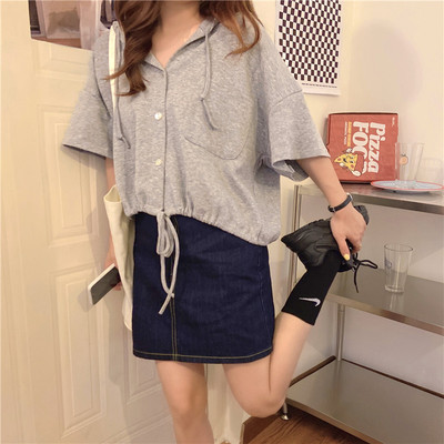 Real shot short student hooded T-shirt short sleeve loose half sleeve cardigan drawstring top