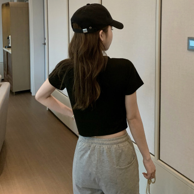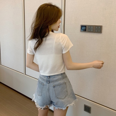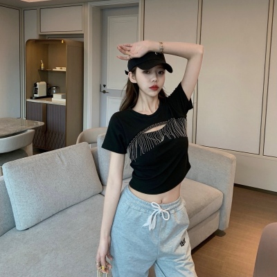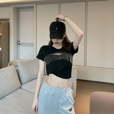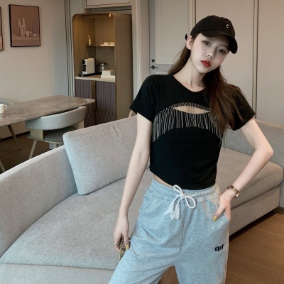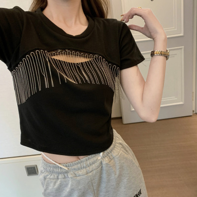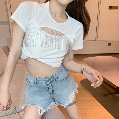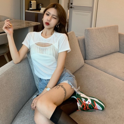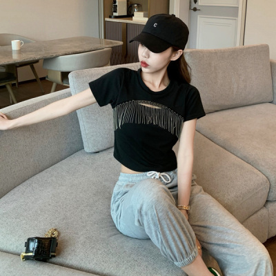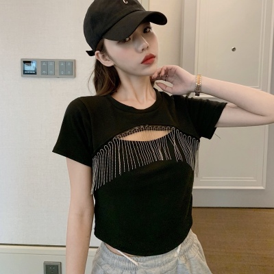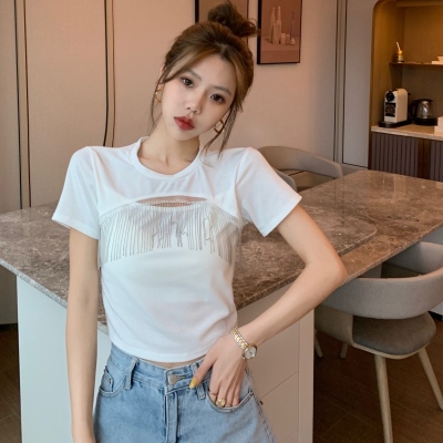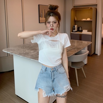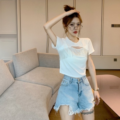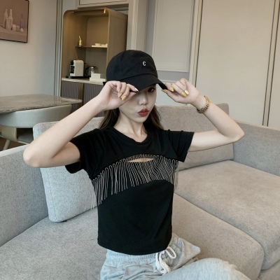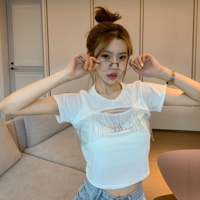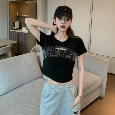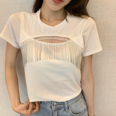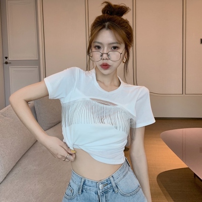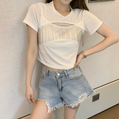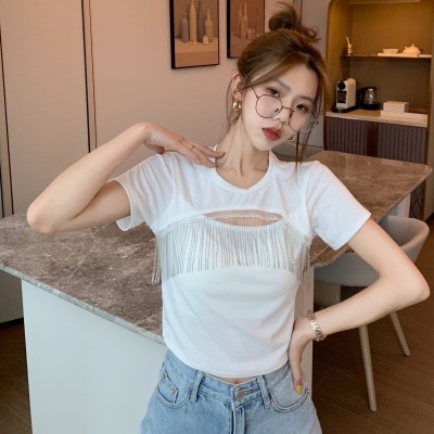 Careful machine tassel short sleeve T-shirt women's cotton real shot
