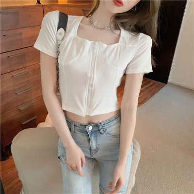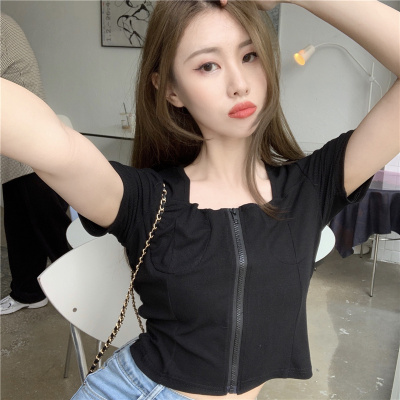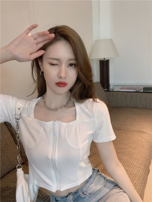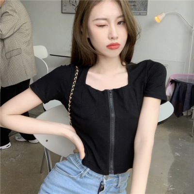 Real shooting square collar open navel short sleeve T-shirt real price