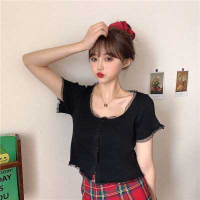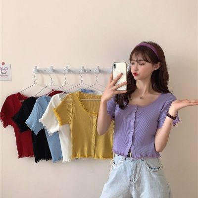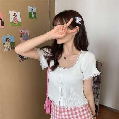 2021 new net red lace square collar thin knitted shirt women's summer purple BM short cardigan