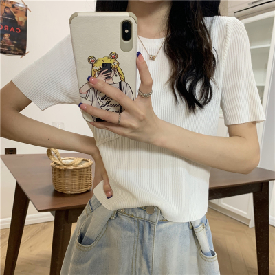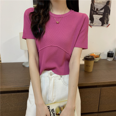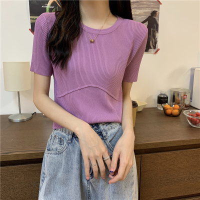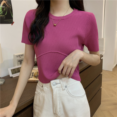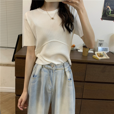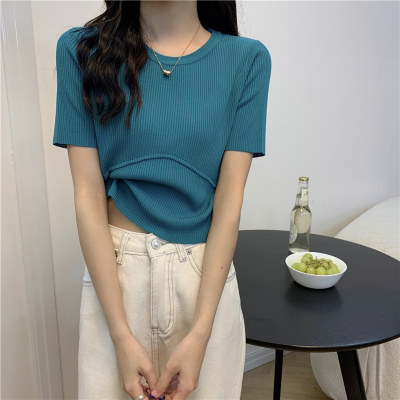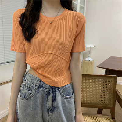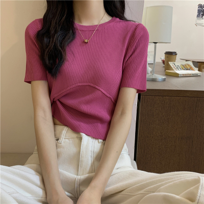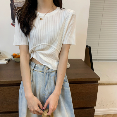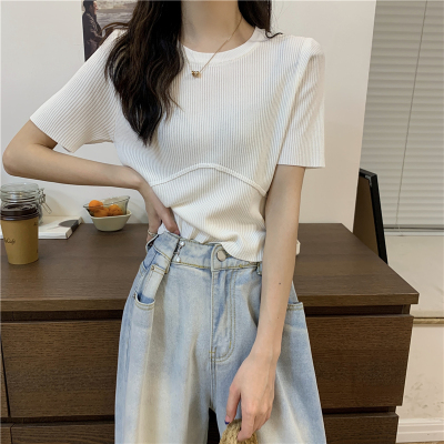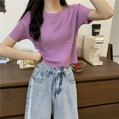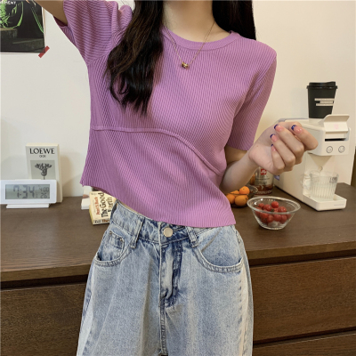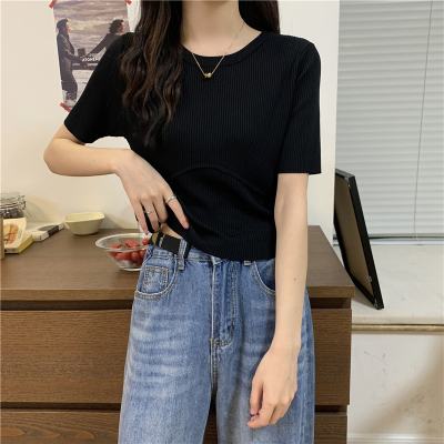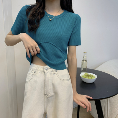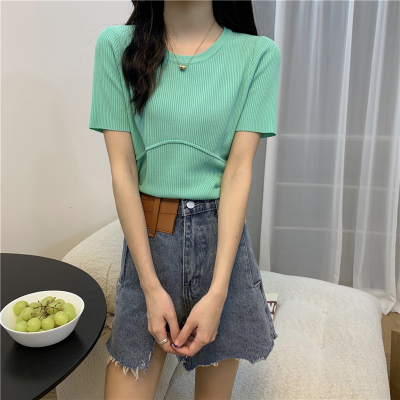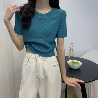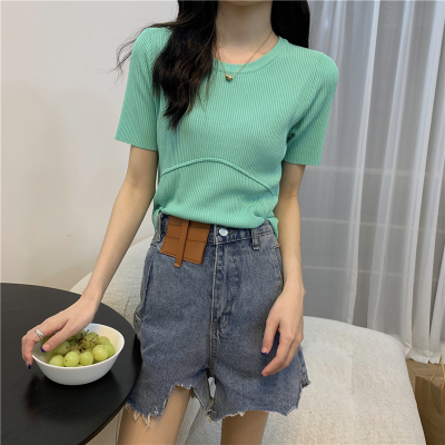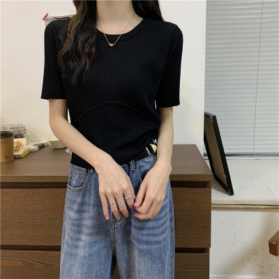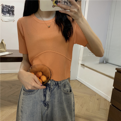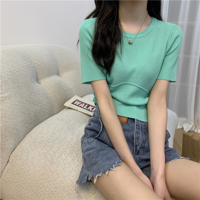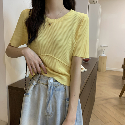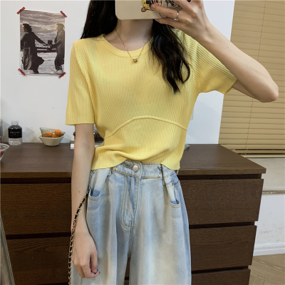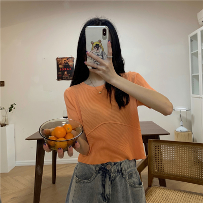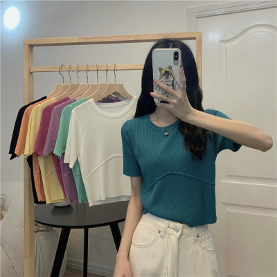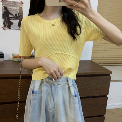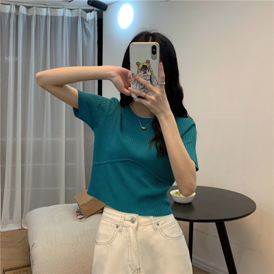 實拍實價 新款純色針織衫短袖顯瘦短款上衣