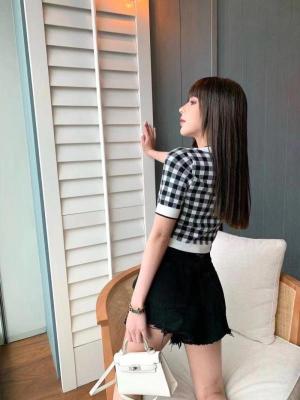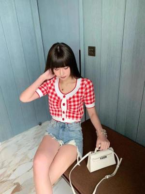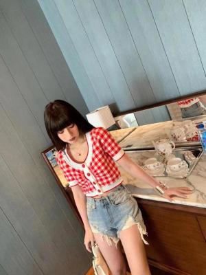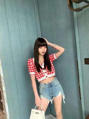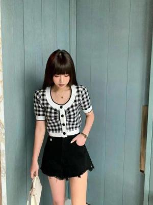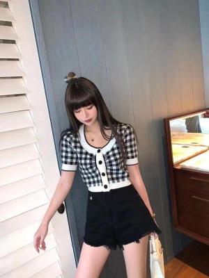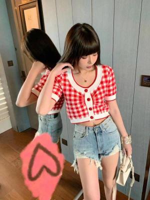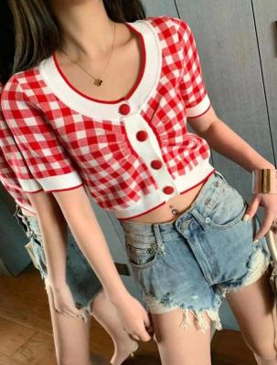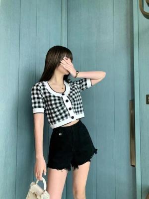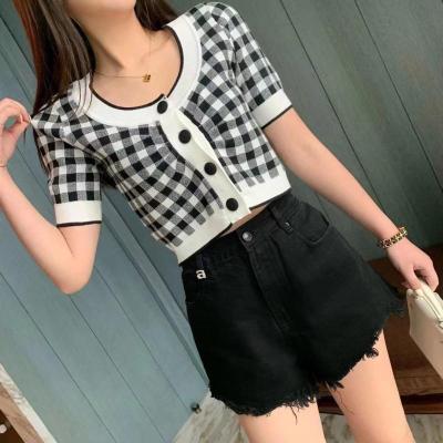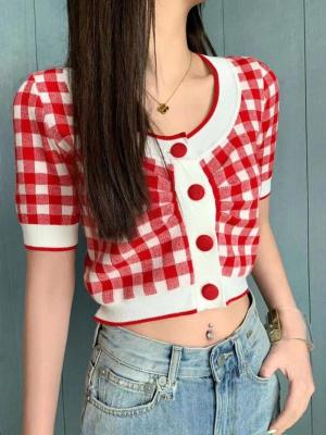 針織小開衫女裝夏季薄款復古格子短款毛衣2021年新款收腰短袖上衣