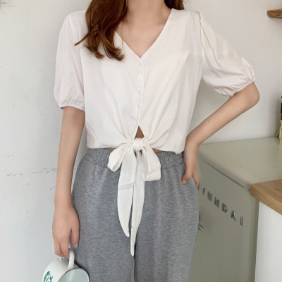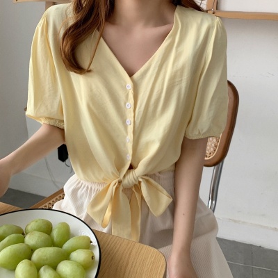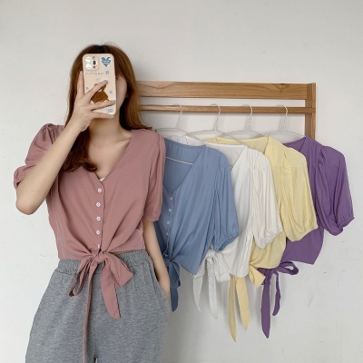 Real shot real price summer ice candy color buckle knot design Short Sleeve Shirt