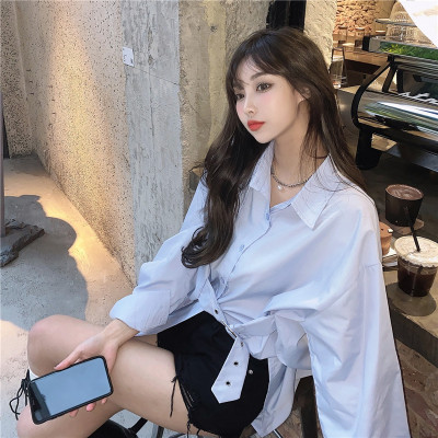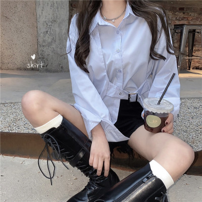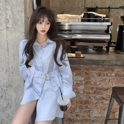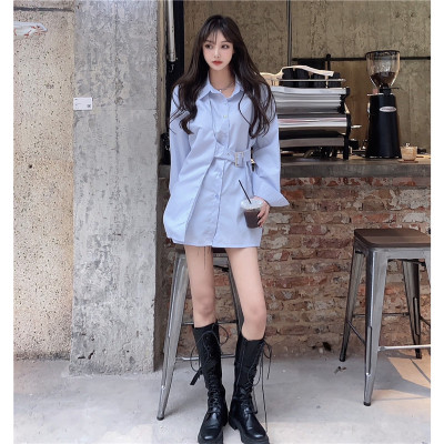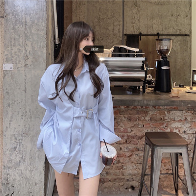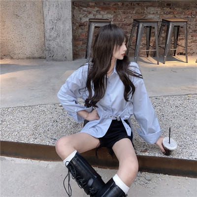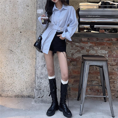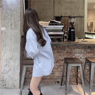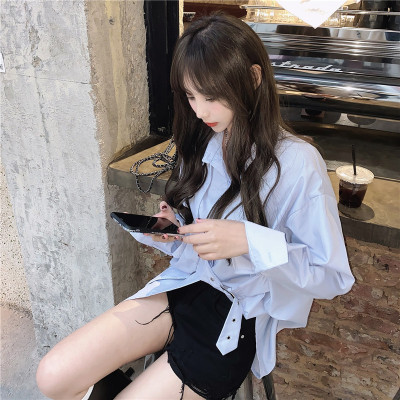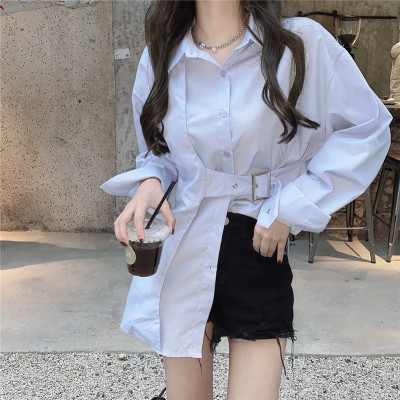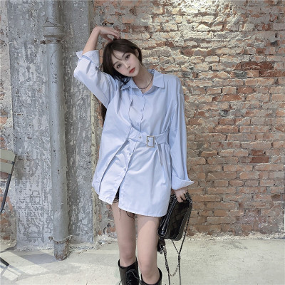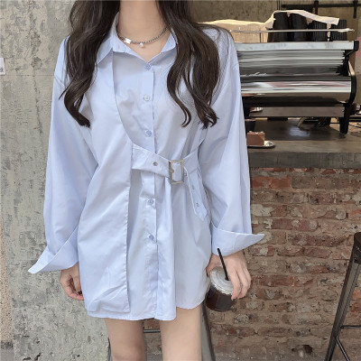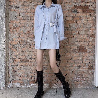 Real price new irregular long sleeve medium length shirt personalized blue shirt casual top female