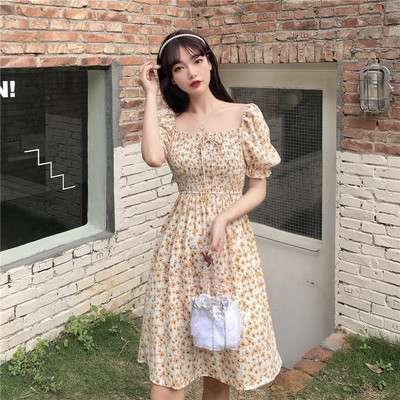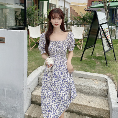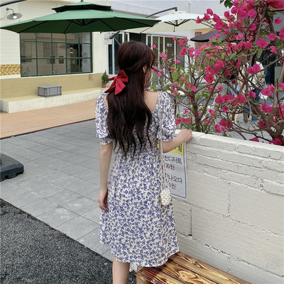 Real price new summer air Platycodon square neck short sleeve waist slim Floral Dress