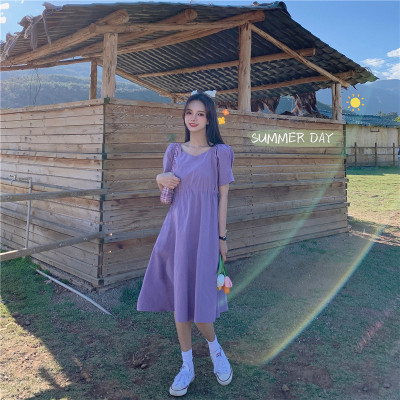紫色連衣裙女2021新款春季高腰法式復古超仙溫柔顯瘦抽繩v領裙子