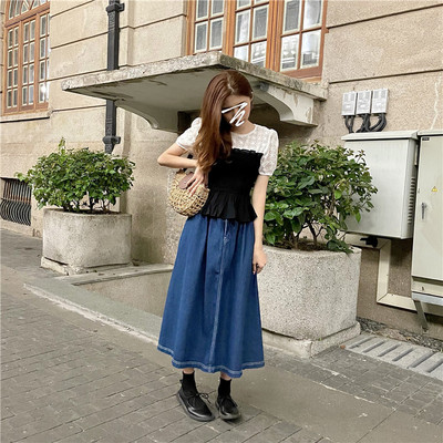 實拍實價~夏季韓版褶皺假兩件拼接蕾絲收腰顯瘦洋氣短袖上衣女