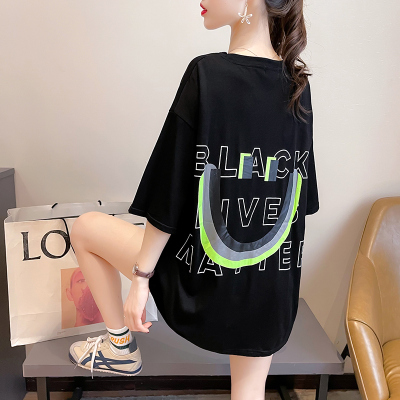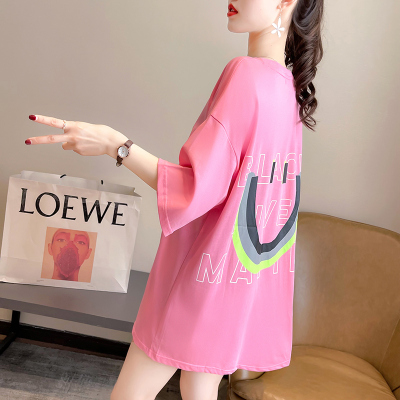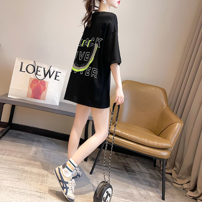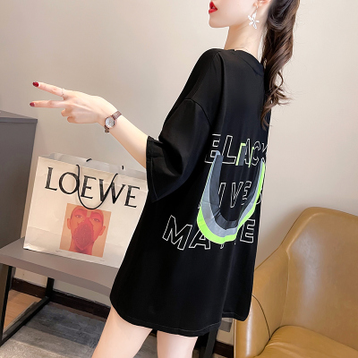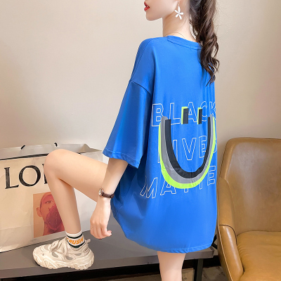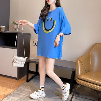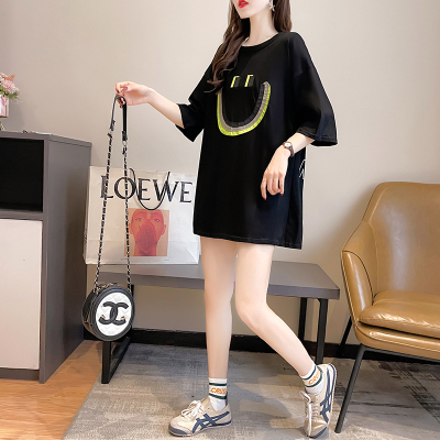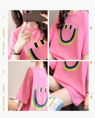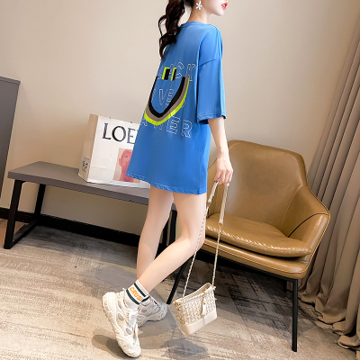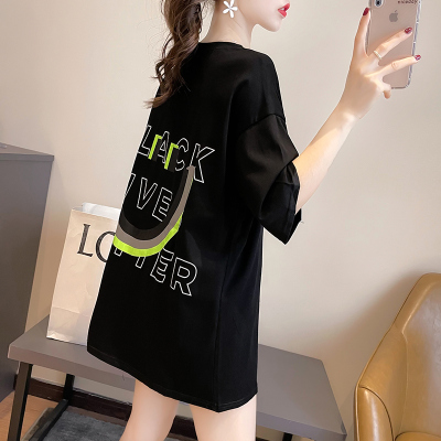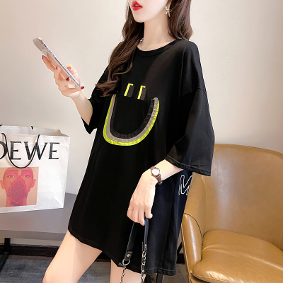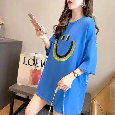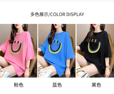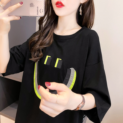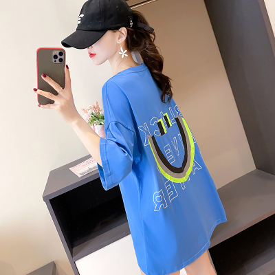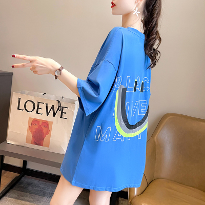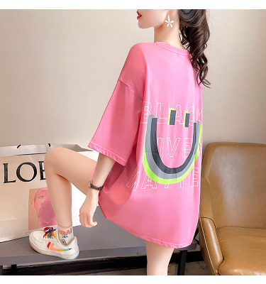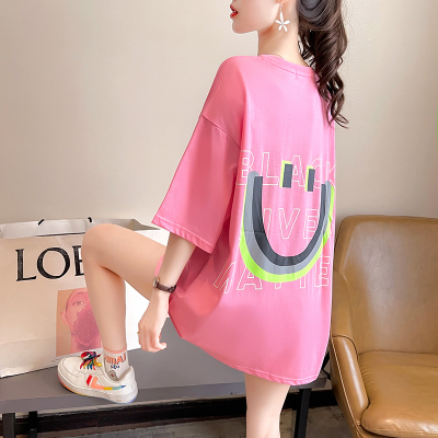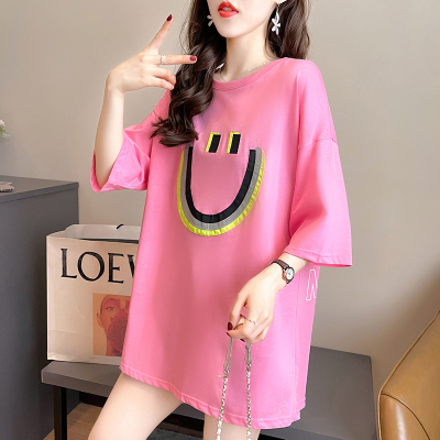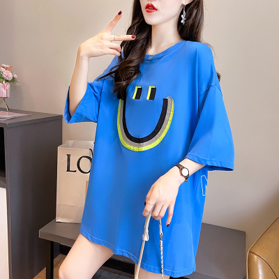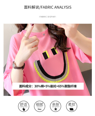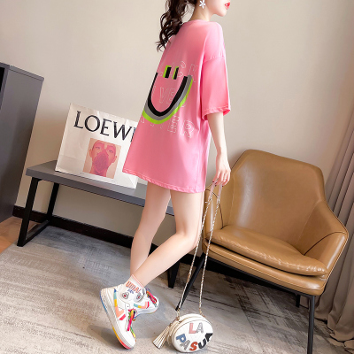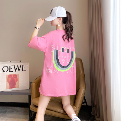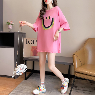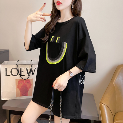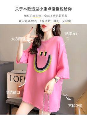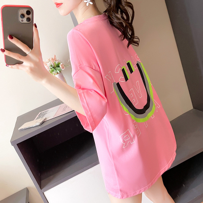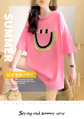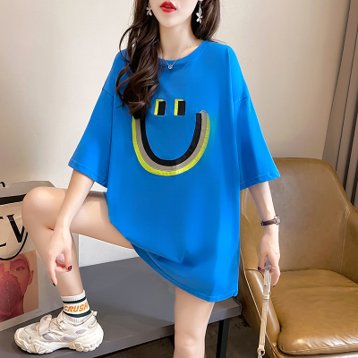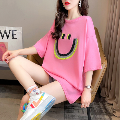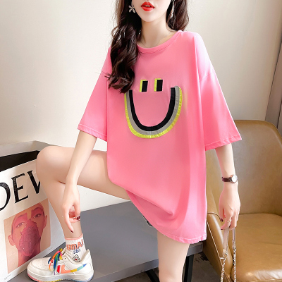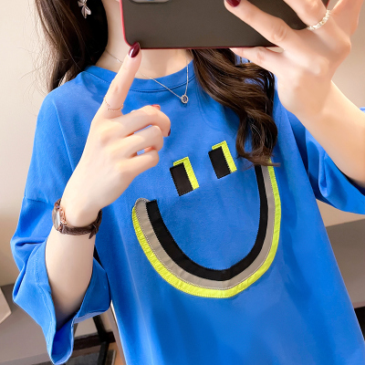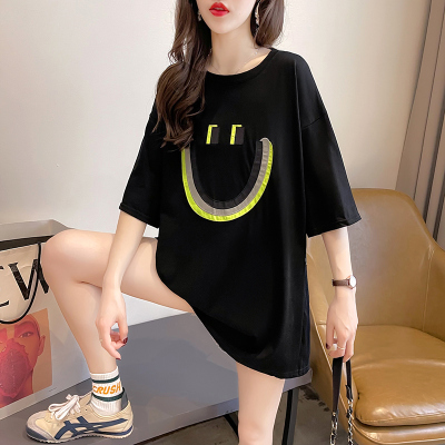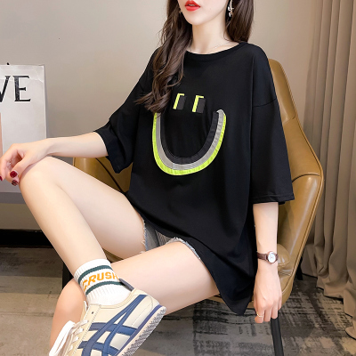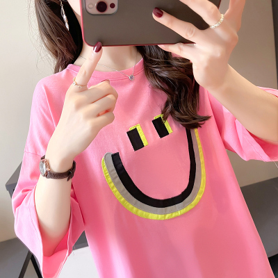 實拍棉質網紅同款笑臉短袖t恤女夏新款圓領中長學生上衣大碼女裝