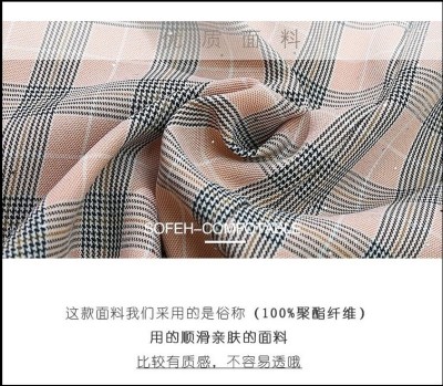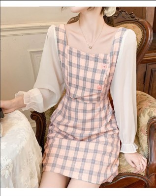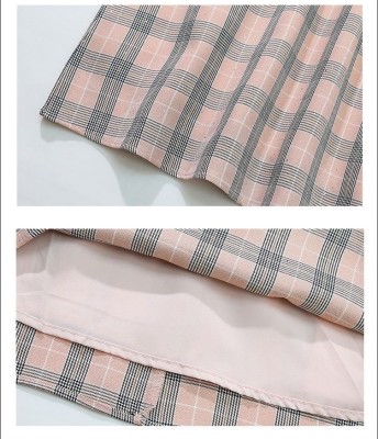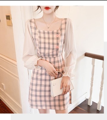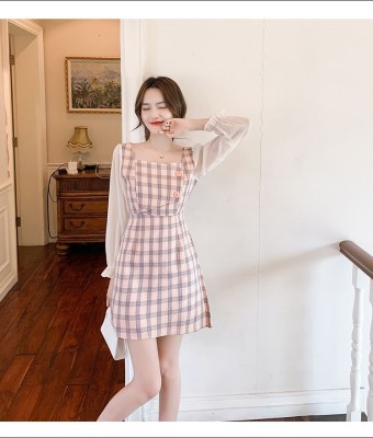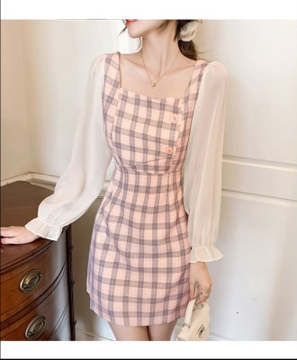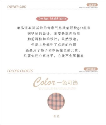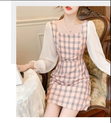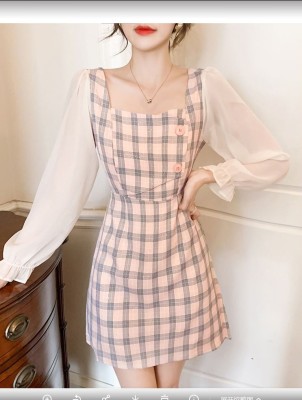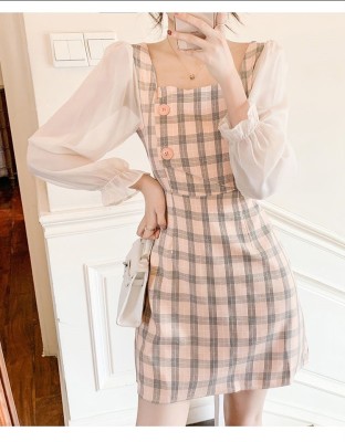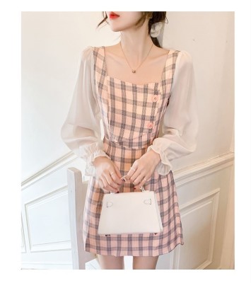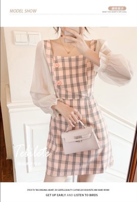 春裝新款洋氣網紗拼接方領泡泡長袖雪紡短裙粉色格子連衣裙女