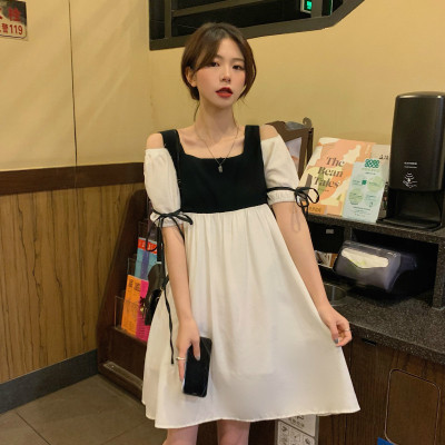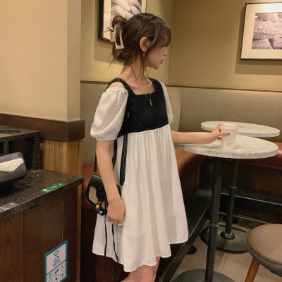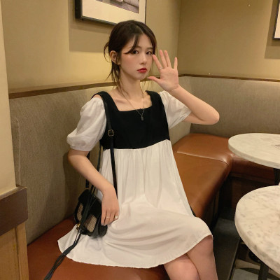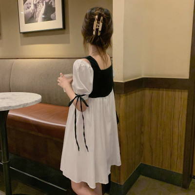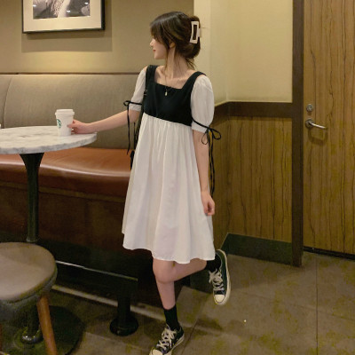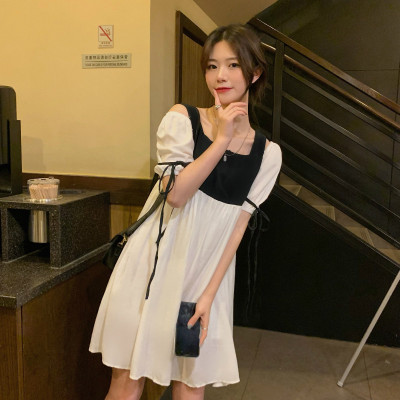 Real price contrast stitching lace up short sleeve dress new French Platycodon grandiflorum in summer