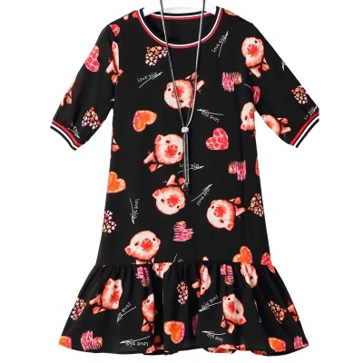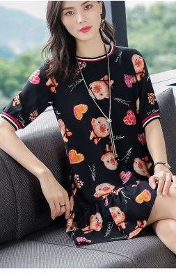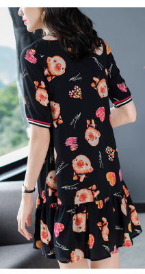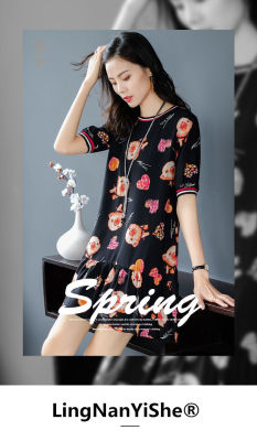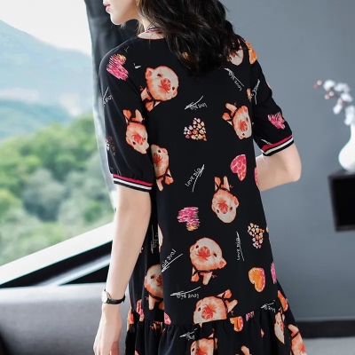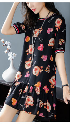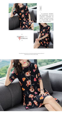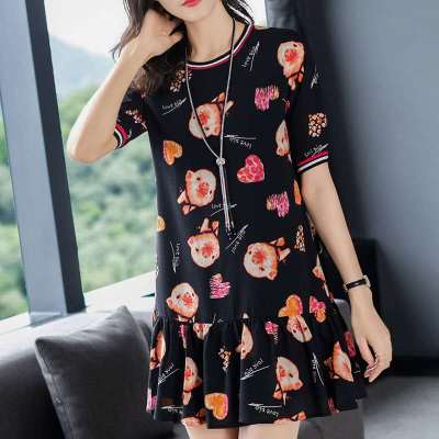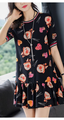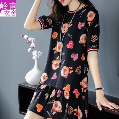 夏季新款高端印花圓領短袖連衣裙韓版寬鬆顯瘦小個子遮肚字裙女