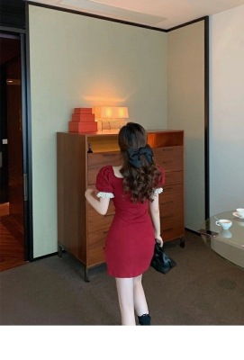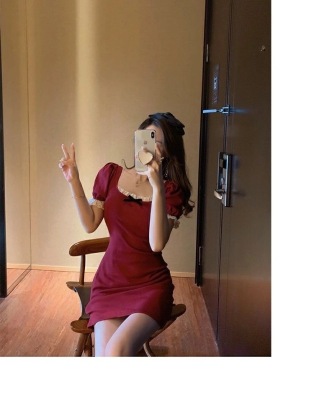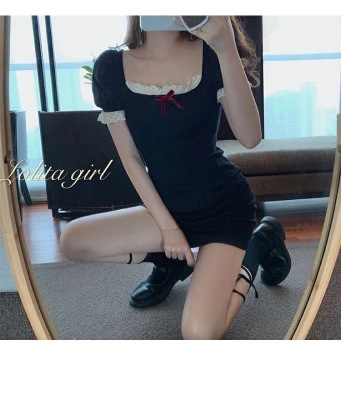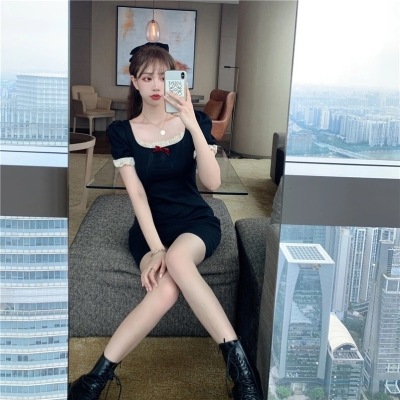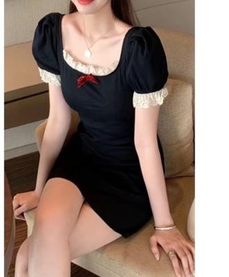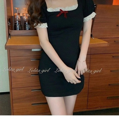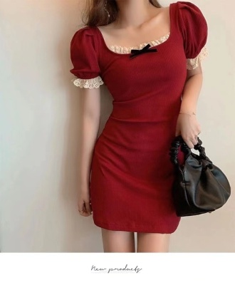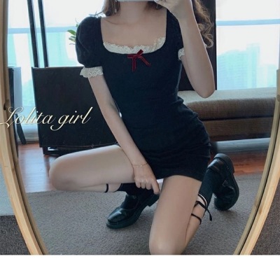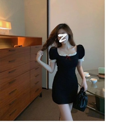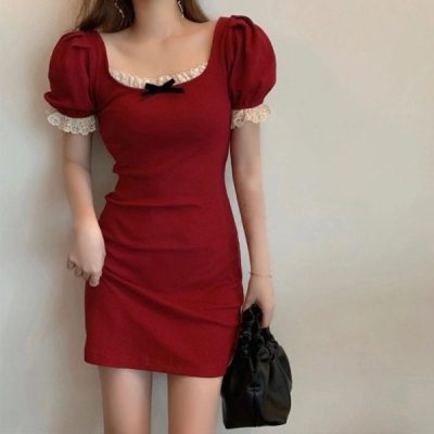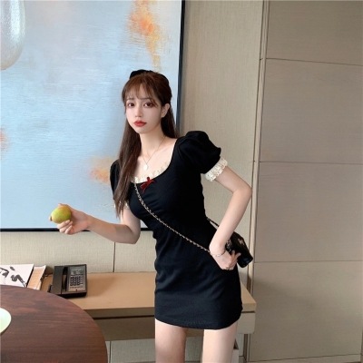 Bow tie lace side square neck stitched waist dress women's French retro bubble sleeve skirt with hip skirt