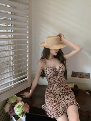 Real price spring and summer new waist show thin leopard pattern sexy V-neck short suspender dress