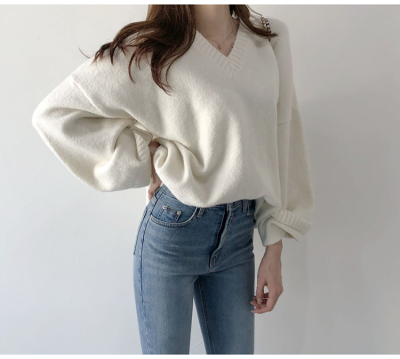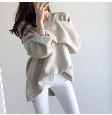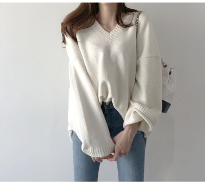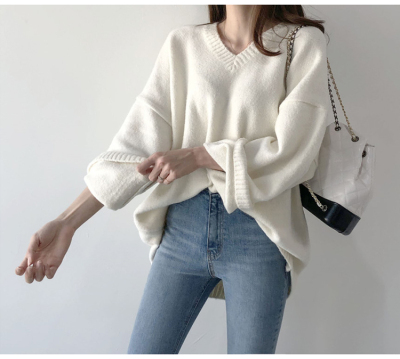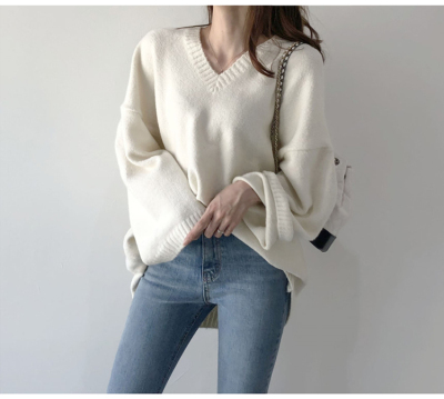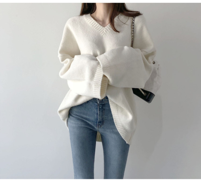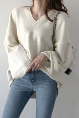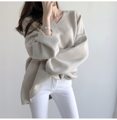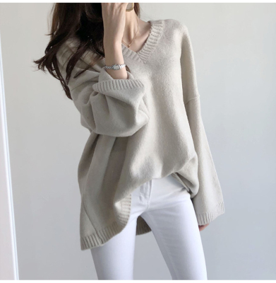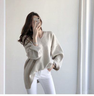 V-neck Pullover solid color loose T-shirt for women to wear thin Korean versatile lazy sweater with split coat