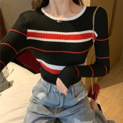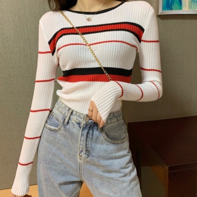 Early autumn new stripe contrast round neck Pullover Sweater mesh red versatile Long Sleeve T-Shirt Top Women