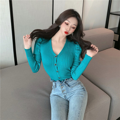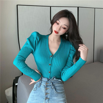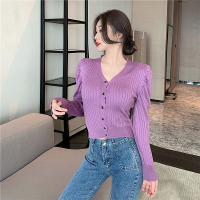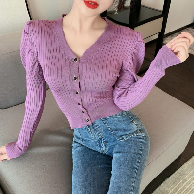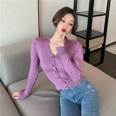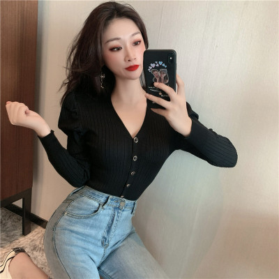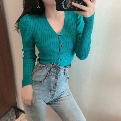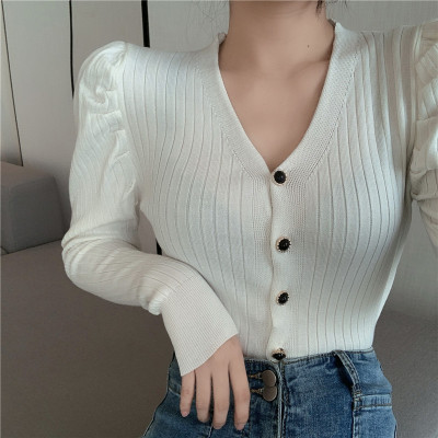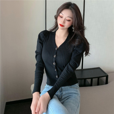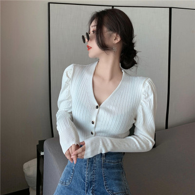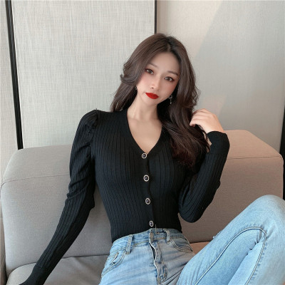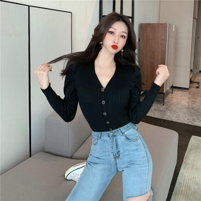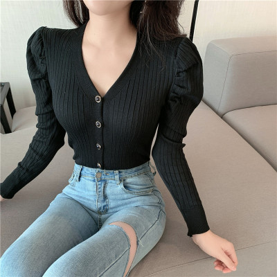 實拍泡泡袖長袖單排扣針織衫實價