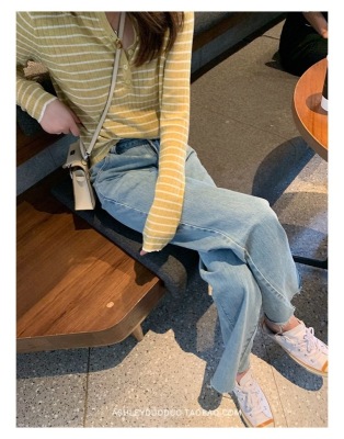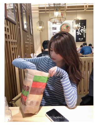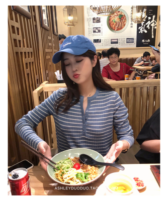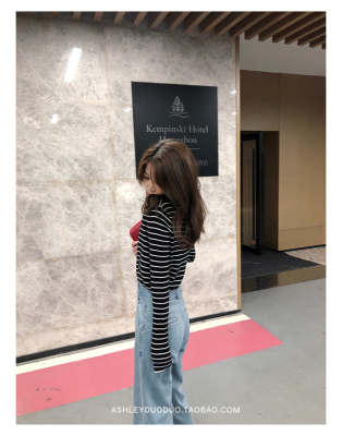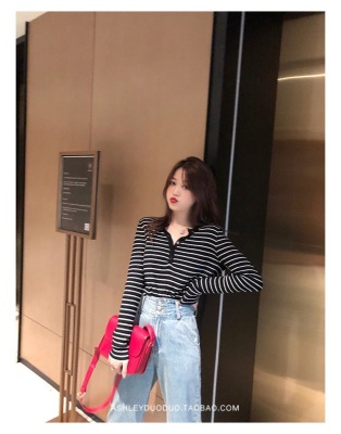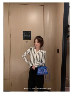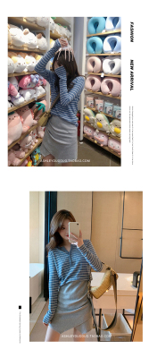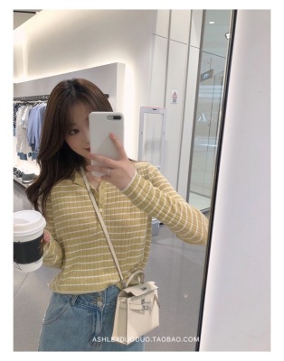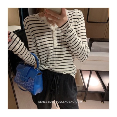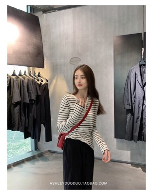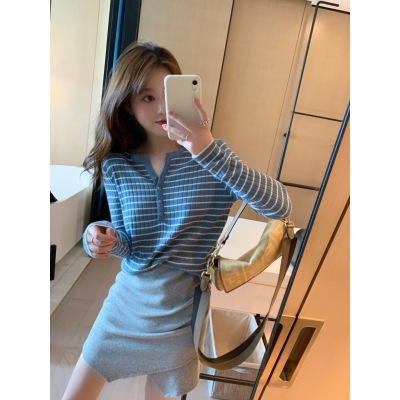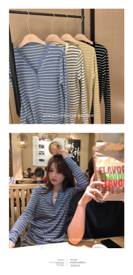 Gentle wind stripe T-shirt for women 2020 new early autumn bottoming shirt long sleeve top loose thin V-Neck Sweater
