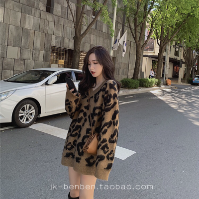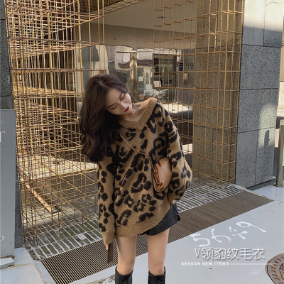 Leopard print V-neck sweater for women, autumn and winter Korean style lazy style loose slimming mid-length contrast color outer top
