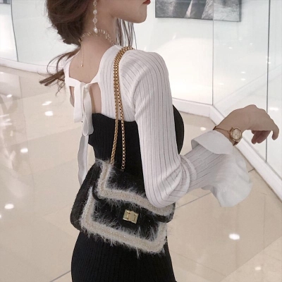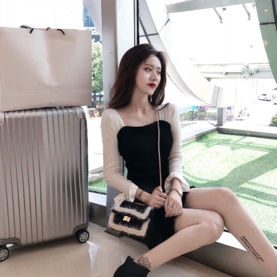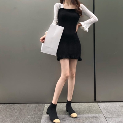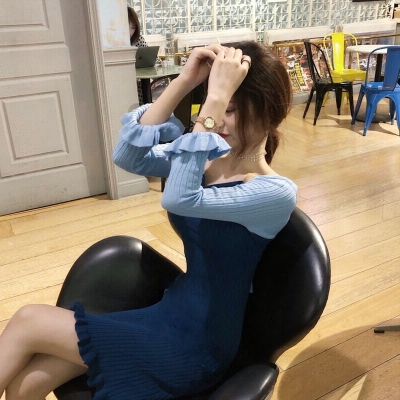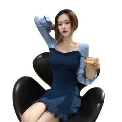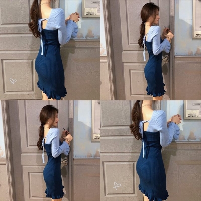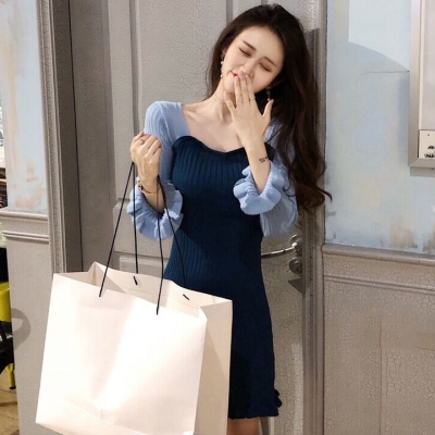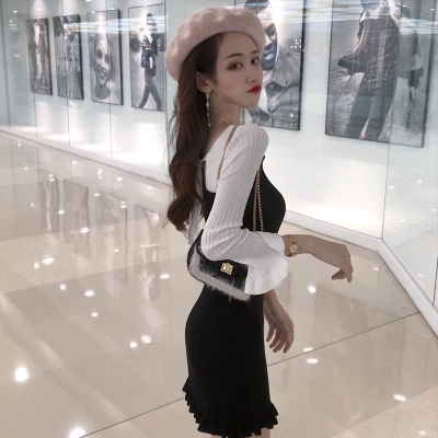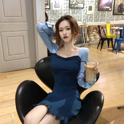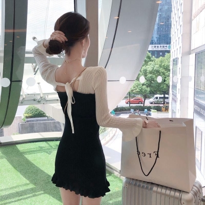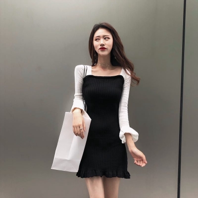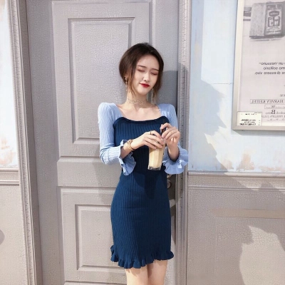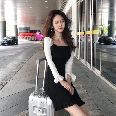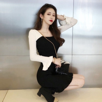 Autumn 2020 new Korean dress women's collar contrast trumpet sleeve net red long sleeve knitted skirt ins fashion