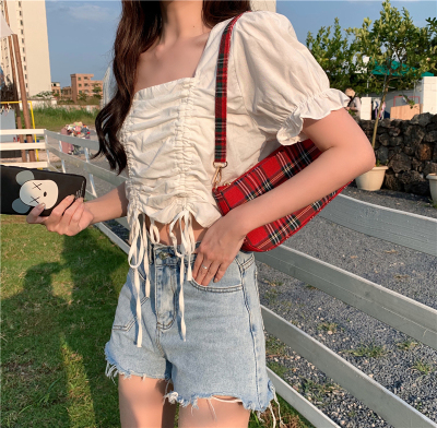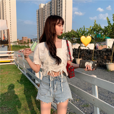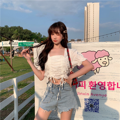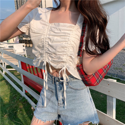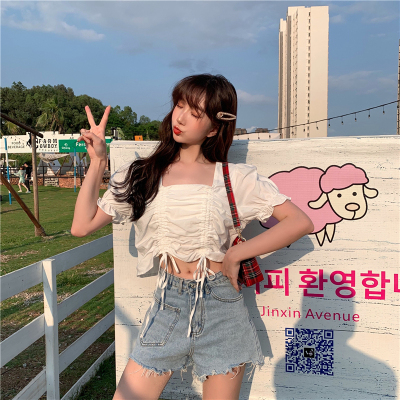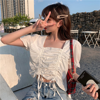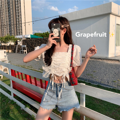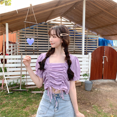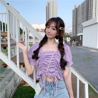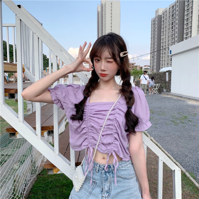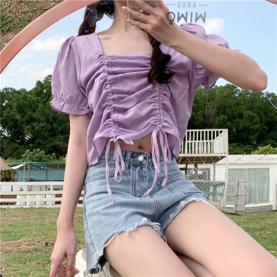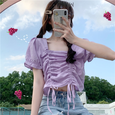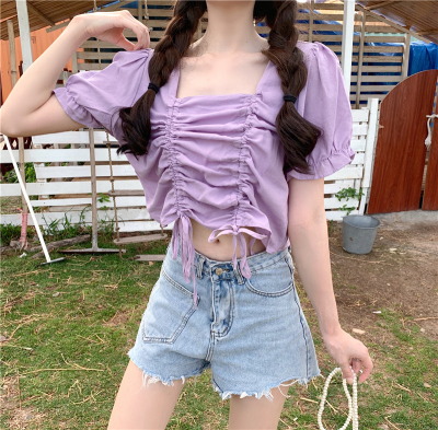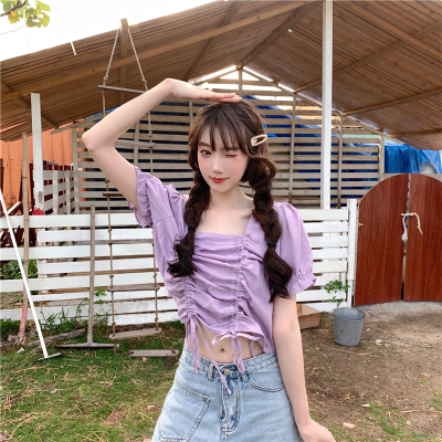 Real price 2021 new purple drawstring loose open navel short design Short Sleeve Shirt Blouse