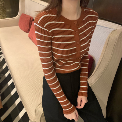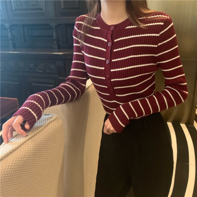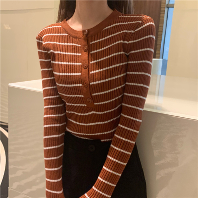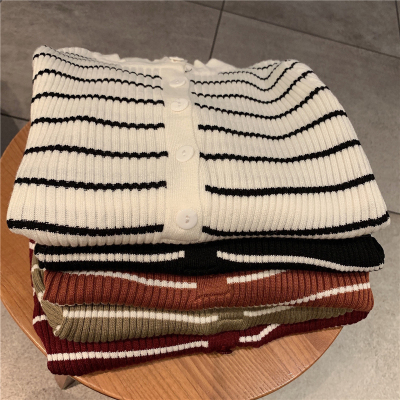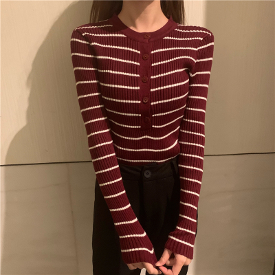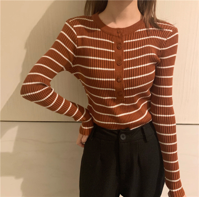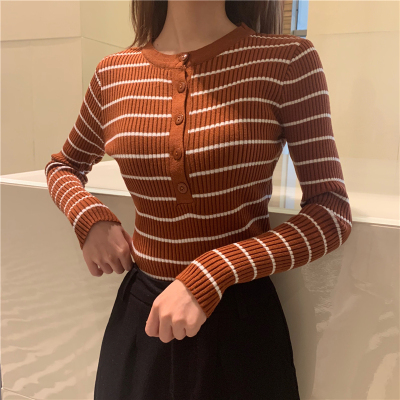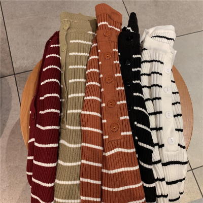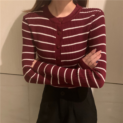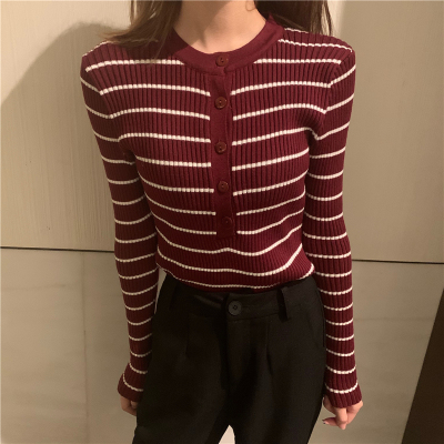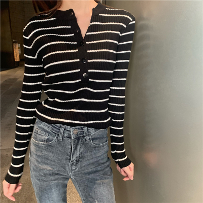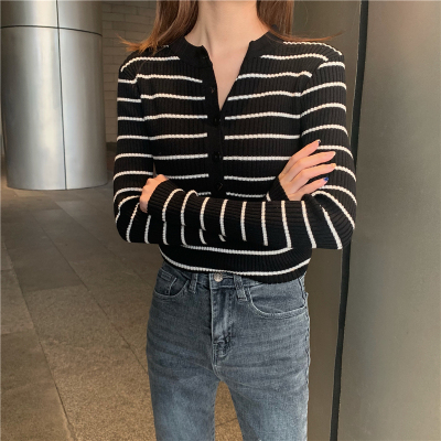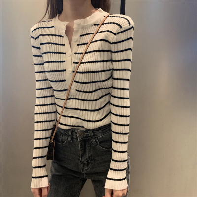 2020 new Korean literary striped slim bottoming shirt with half open collar and V-neck