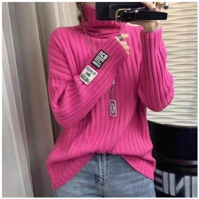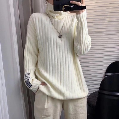 Europe station autumn / winter 2020 new vertical stripe high neck sweater women's loose and lazy Pullover solid color knitted bottoming shirt