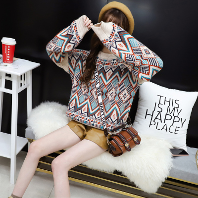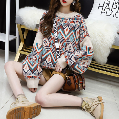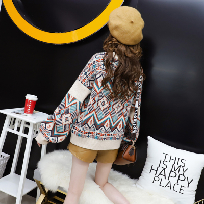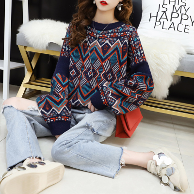 Fashion round neck Pullover short long sleeve totem diamond flower design knitted sweet top sweater for women