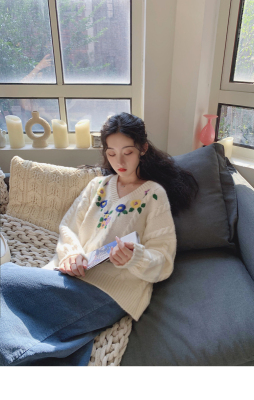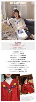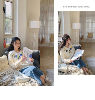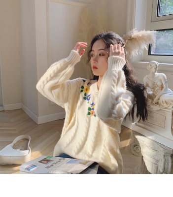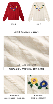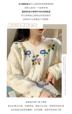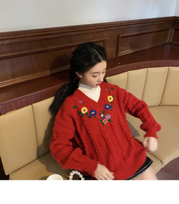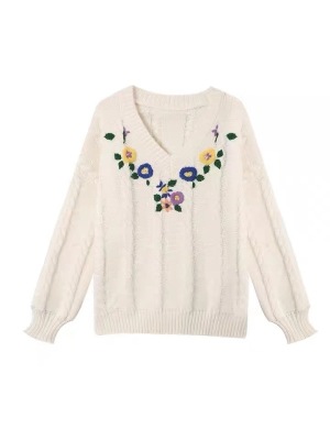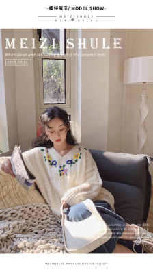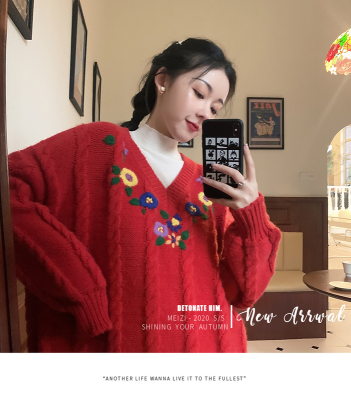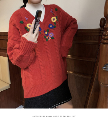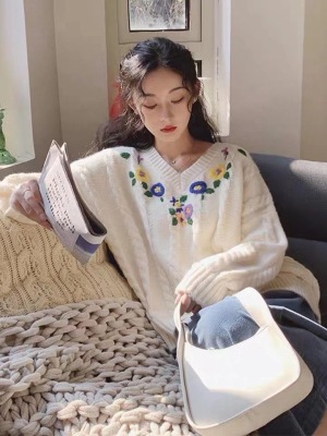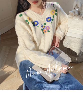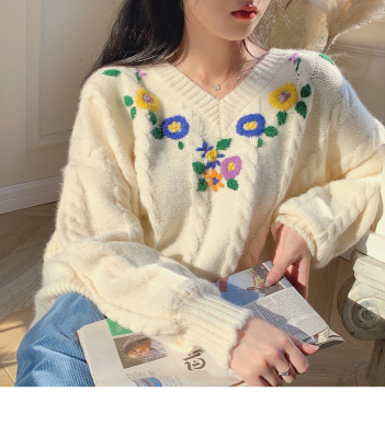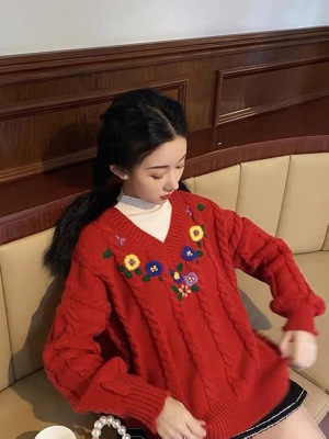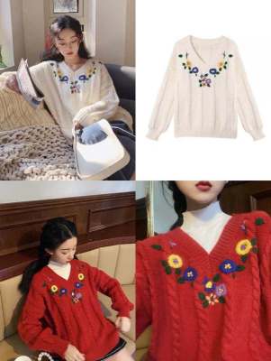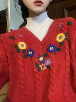 Plum ripe, hand embroidered autumn Pullover long sleeve sweater Japanese loose lazy collar Knitted Top