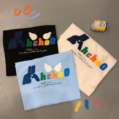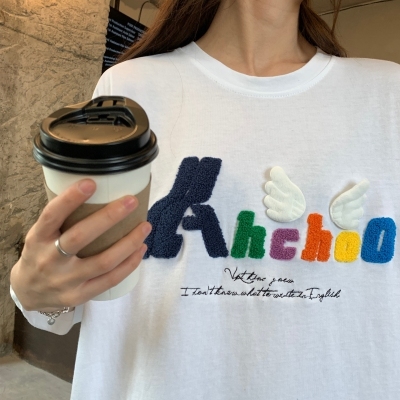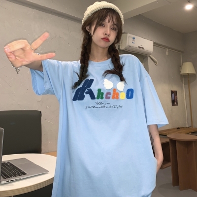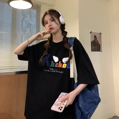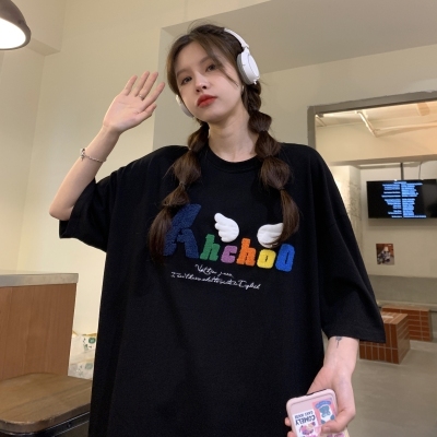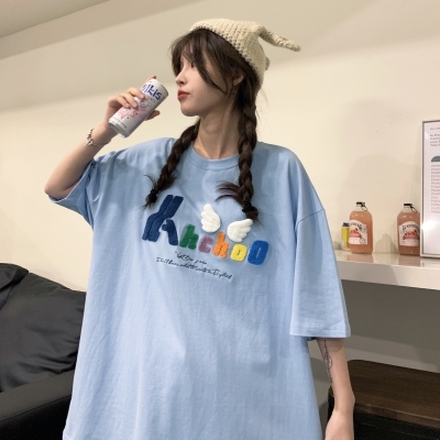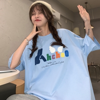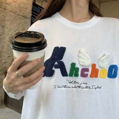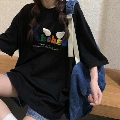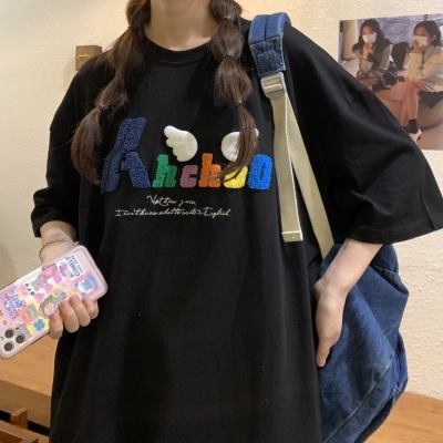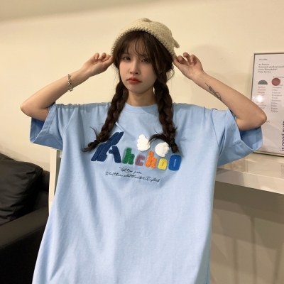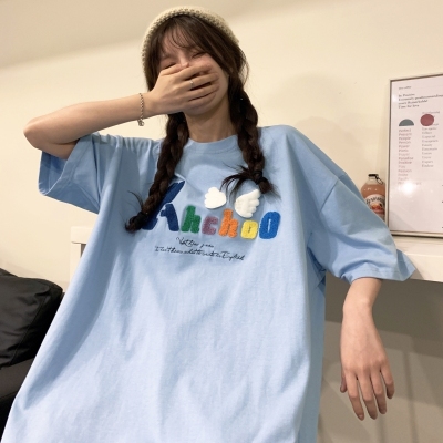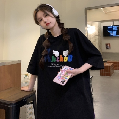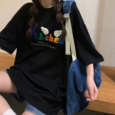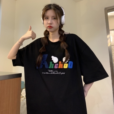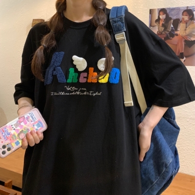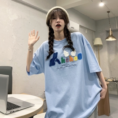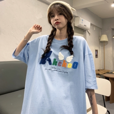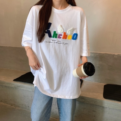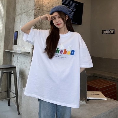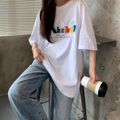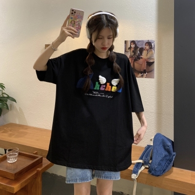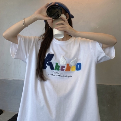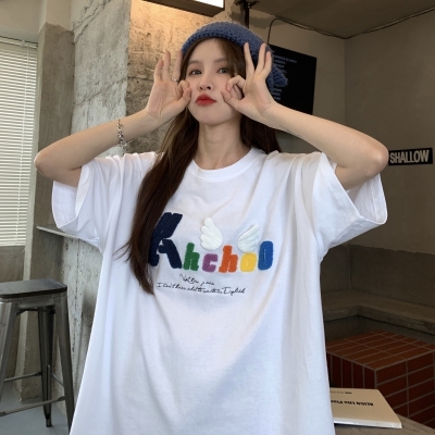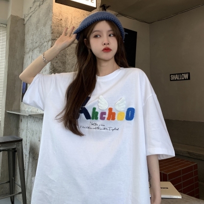 Real shot short sleeve T-shirt women's towel embroidery medium length loose half sleeve top summer
