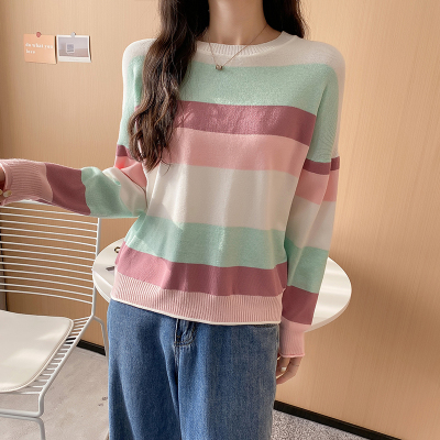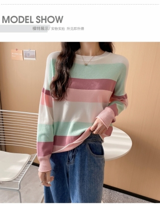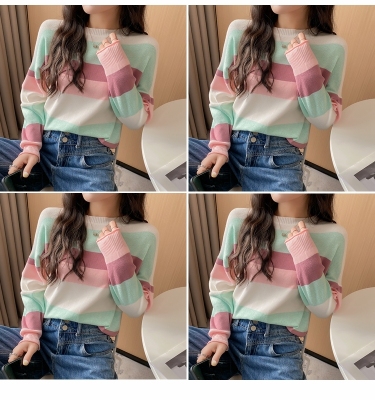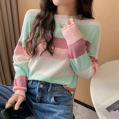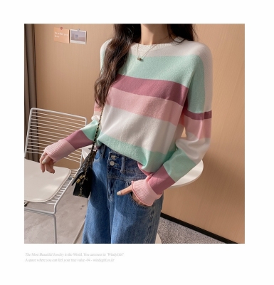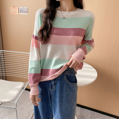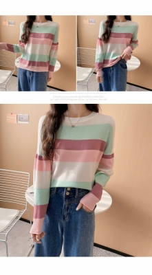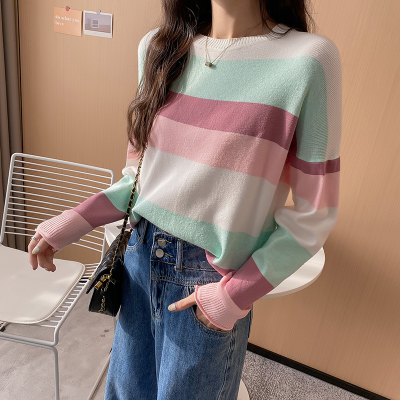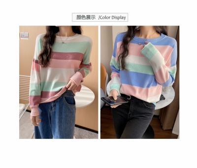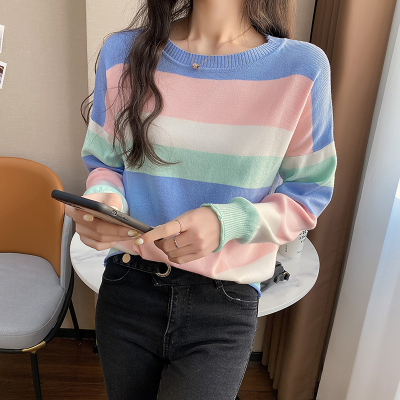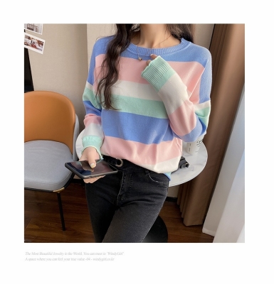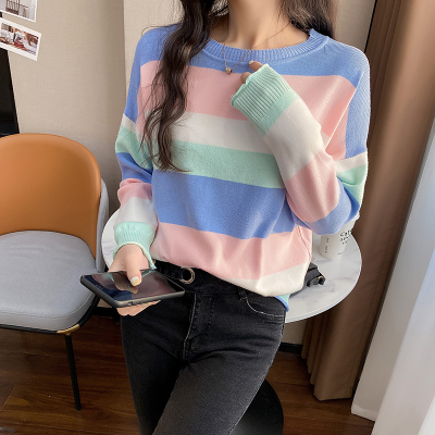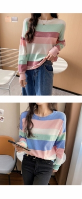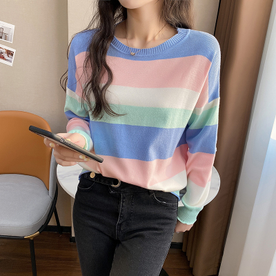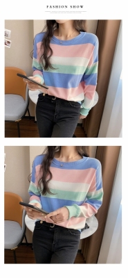Real shooting early spring new students wear long sleeve t-girl lazy wind rainbow strip versatile bottomed sweater