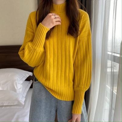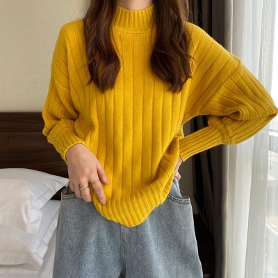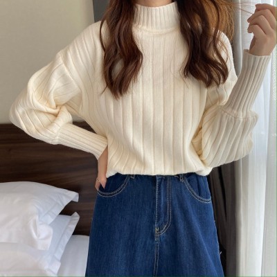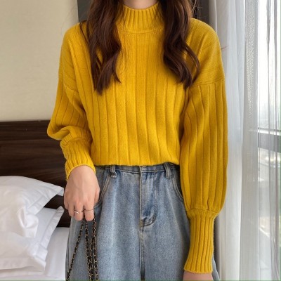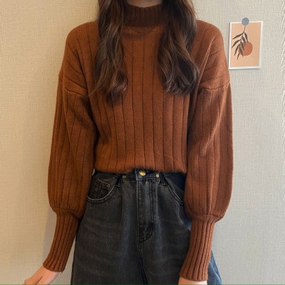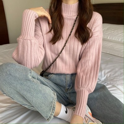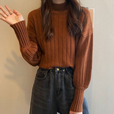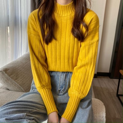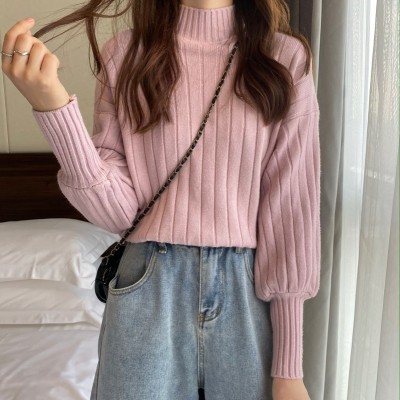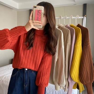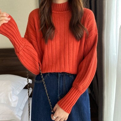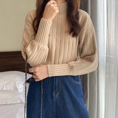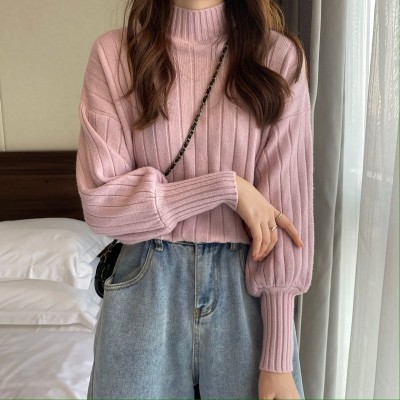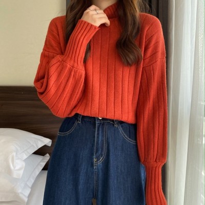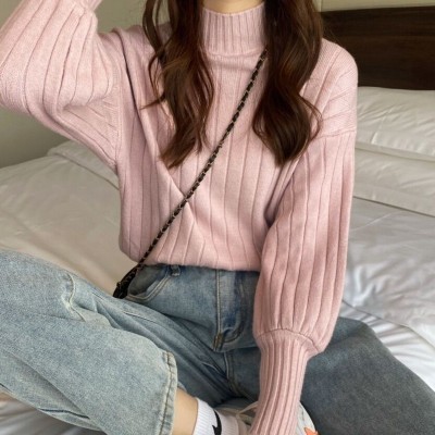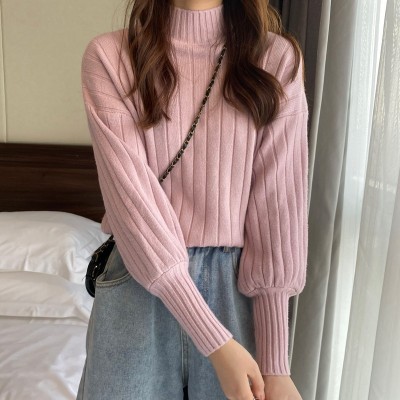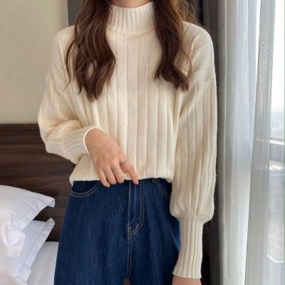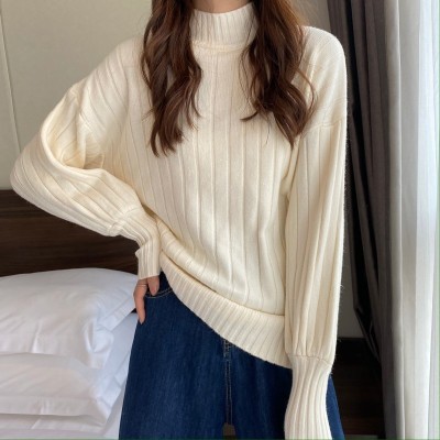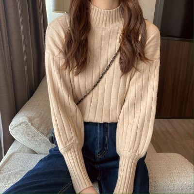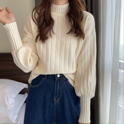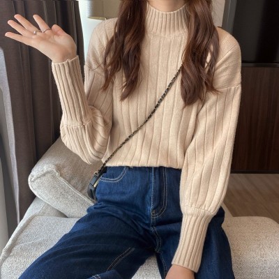 Real price real shot new Korean version lazy wind sliding shoulder Lantern Sleeve pit strip versatile half high collar Pullover Sweater Top