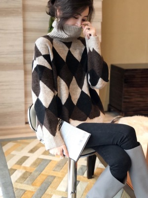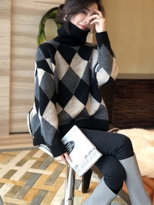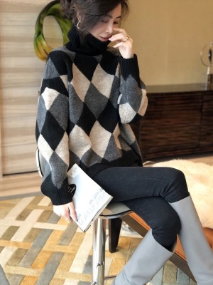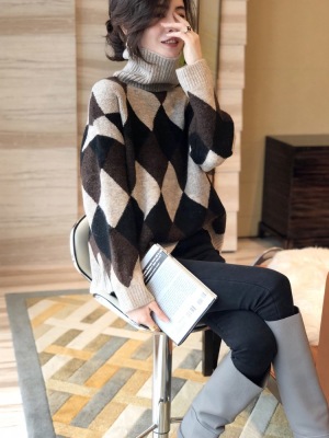Europe station winter new European women's fashion high collar cashmere sweater women's backing diamond sweater fashion