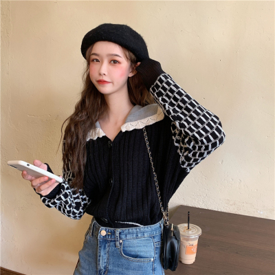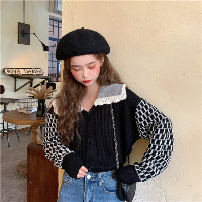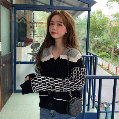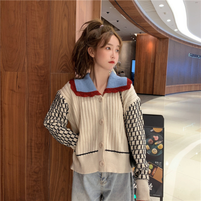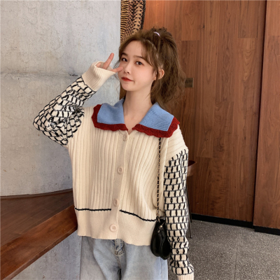 Color matching baby collar T-Shirt Top early autumn women's dress Korean loose long sleeve sweater cardigan coat