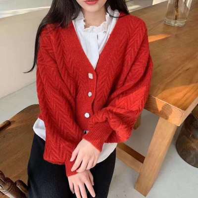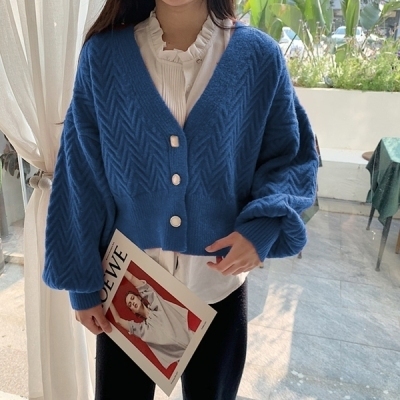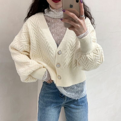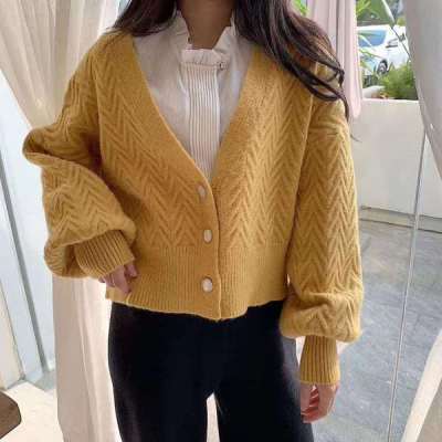 Single breasted Lantern Sleeve knitted cardigan women's early autumn new Korean V-neck lazy sweater short style jacket