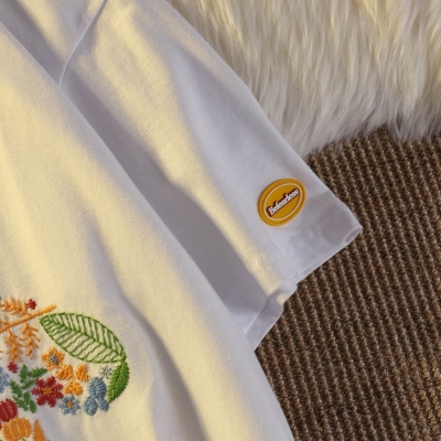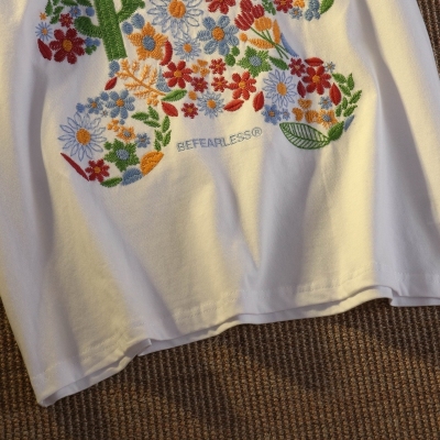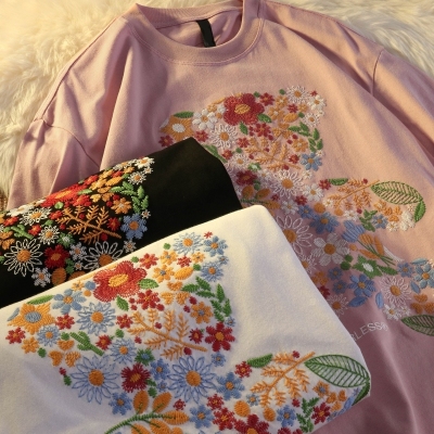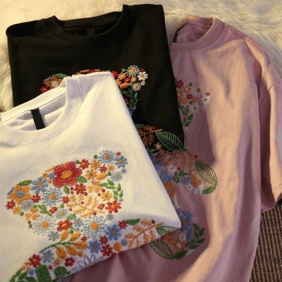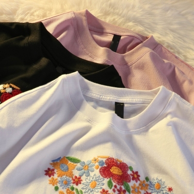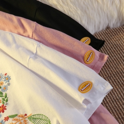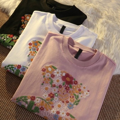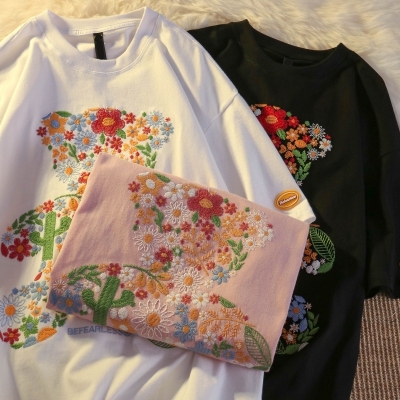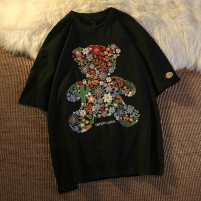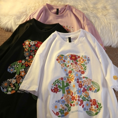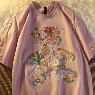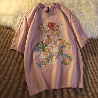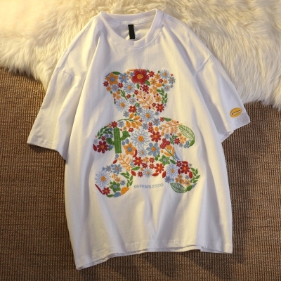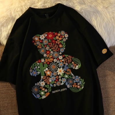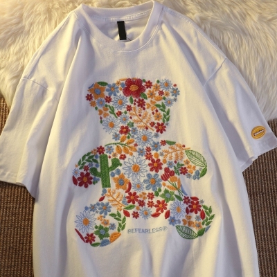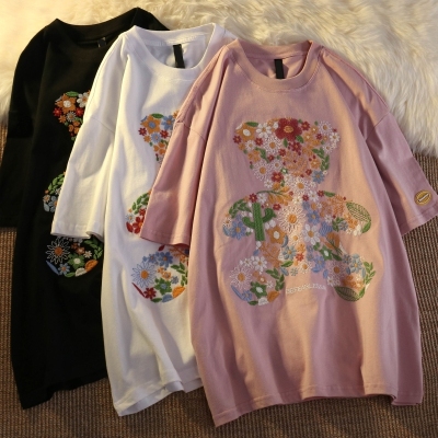 Real shot round neck short sleeve T-shirt bear towel embroidered medium length loose half sleeve top in summer