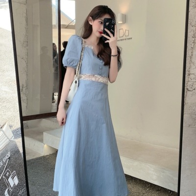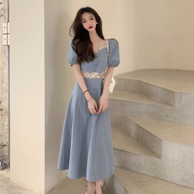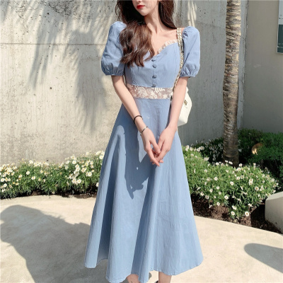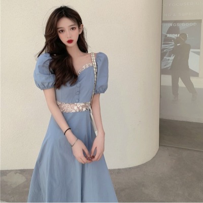 Skirt 2021 new summer French court style retro bubble sleeve dress women's waist slim long skirt