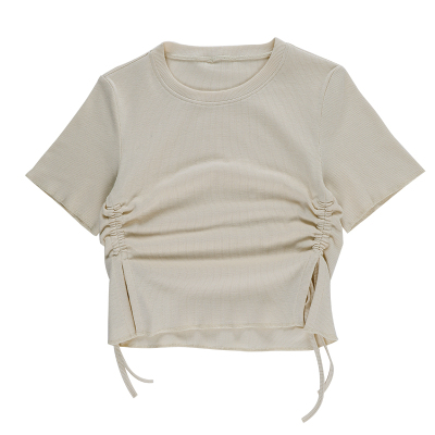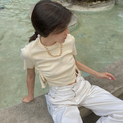 Design sense minority short sleeve T-shirt women's European and American personality drawstring pleated open navel jacket