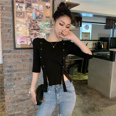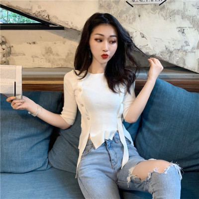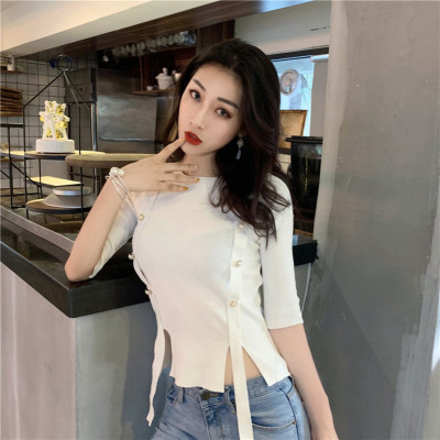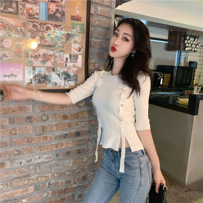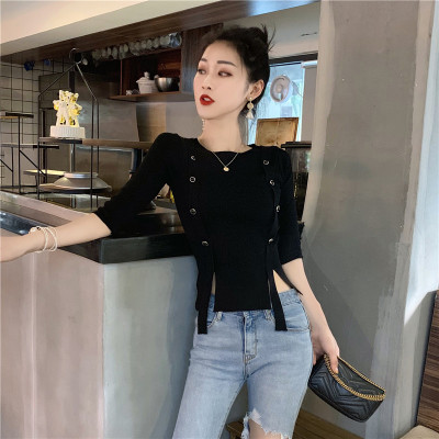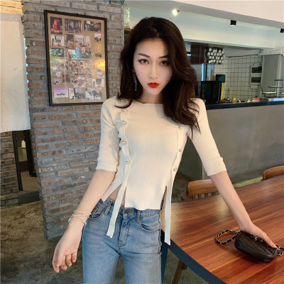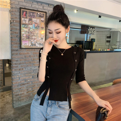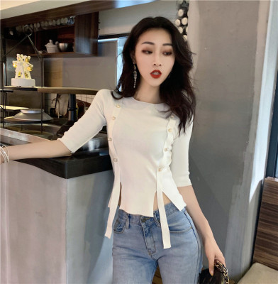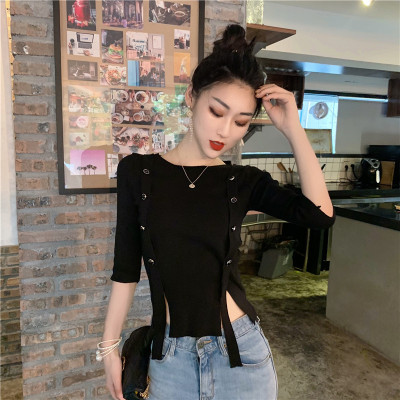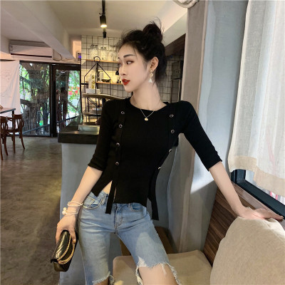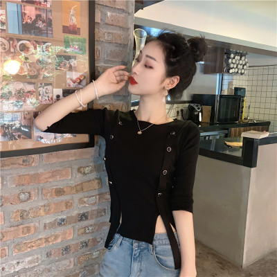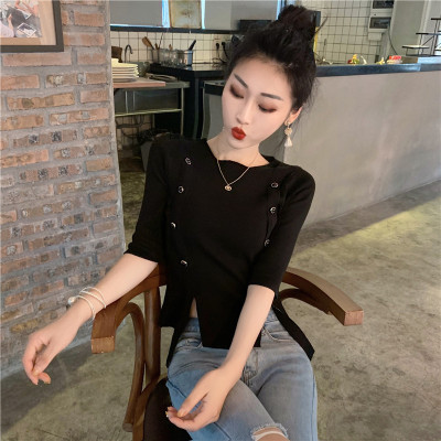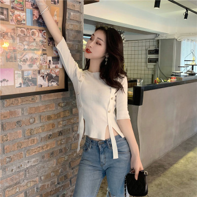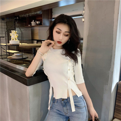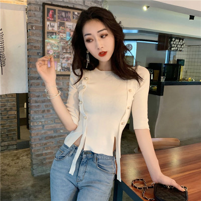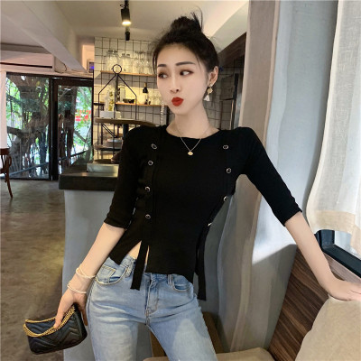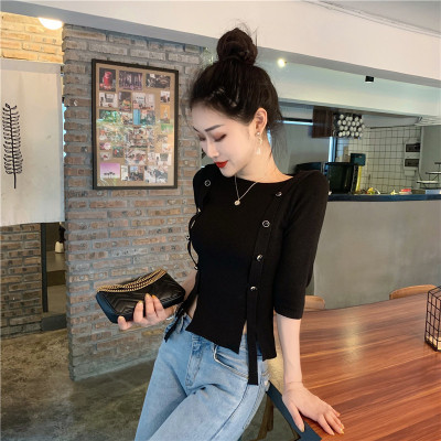 The real shooting temperament is simple and versatile, and the middle sleeve slim fit T-shirt with split streamer button is the real price