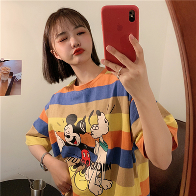 Photo 6535 cotton stripe color short sleeve Mickey T-shirt women's loose large