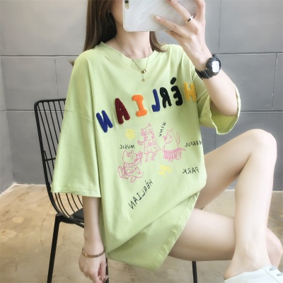 Real photo 100 cotton short sleeve T-shirt for women 2020 new loose Korean flocking cartoon student top large women's dress