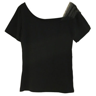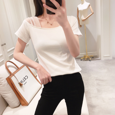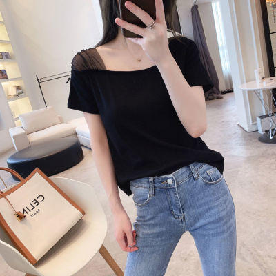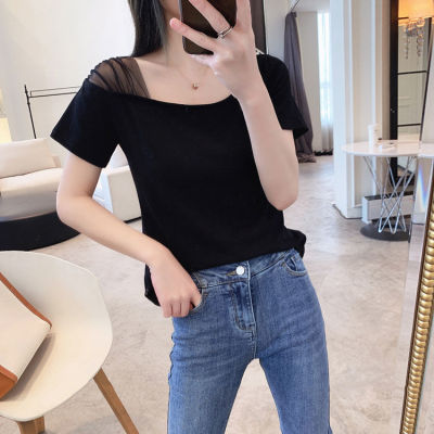 Short sleeve T-shirt women's summer Korean fashion slim mesh splicing off shoulder top women