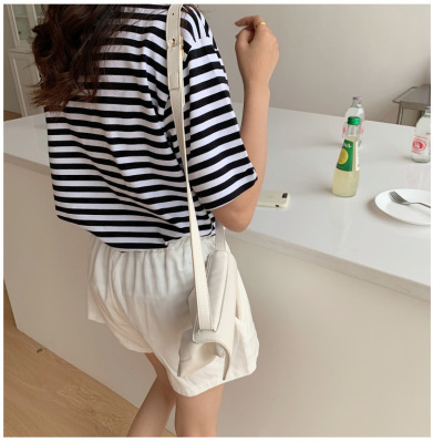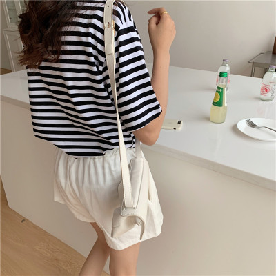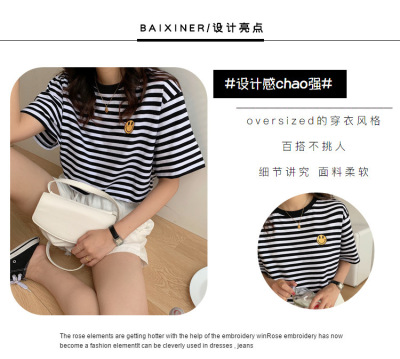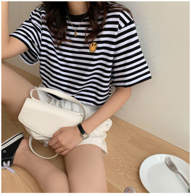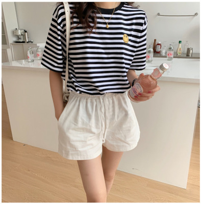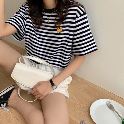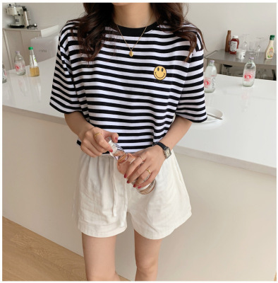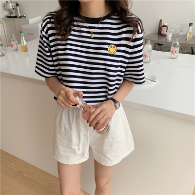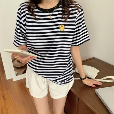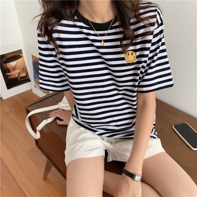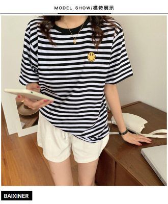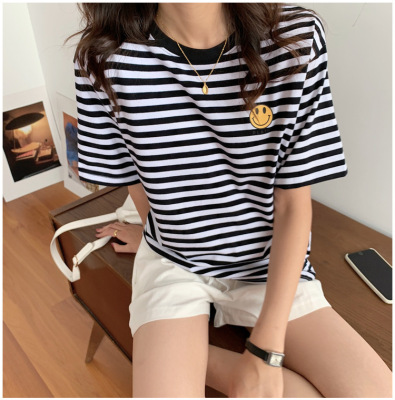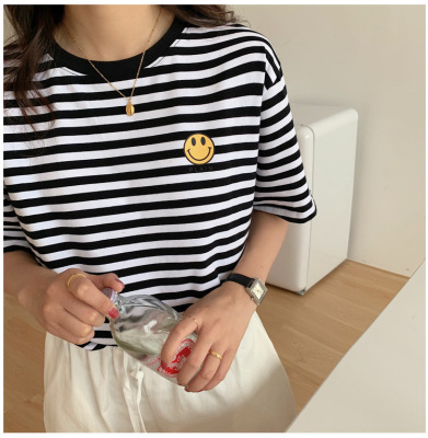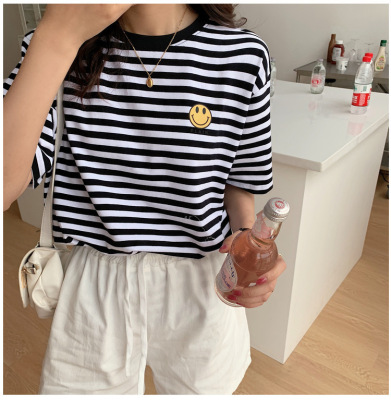 Real shot 6535 cotton summer Korean loose black and white stripe smiley print half sleeve short sleeve T-shirt