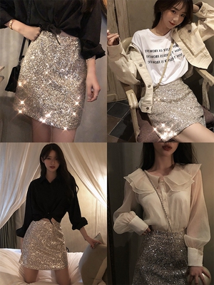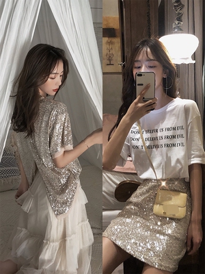 Net red high waist hip dress nightclub sexy BLING bright silk chiffon splicing short sleeve skirt