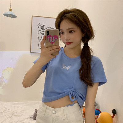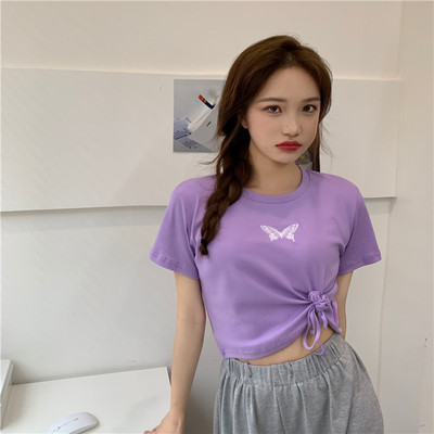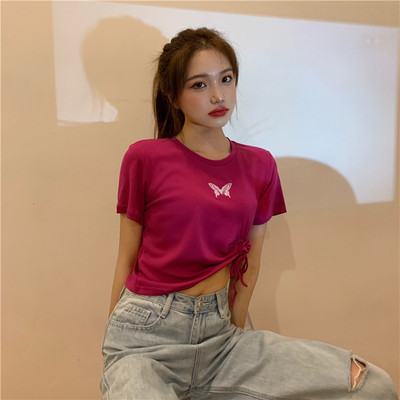 Real price real shot 2021 short high waist Butterfly Embroidery T-shirt with round neck and short sleeve top